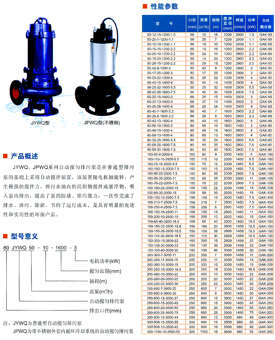 > 産品系列 > 潛水排污泵 防爆潛污泵 > JYWQ JPWQ系列自動攪勻排污泵
